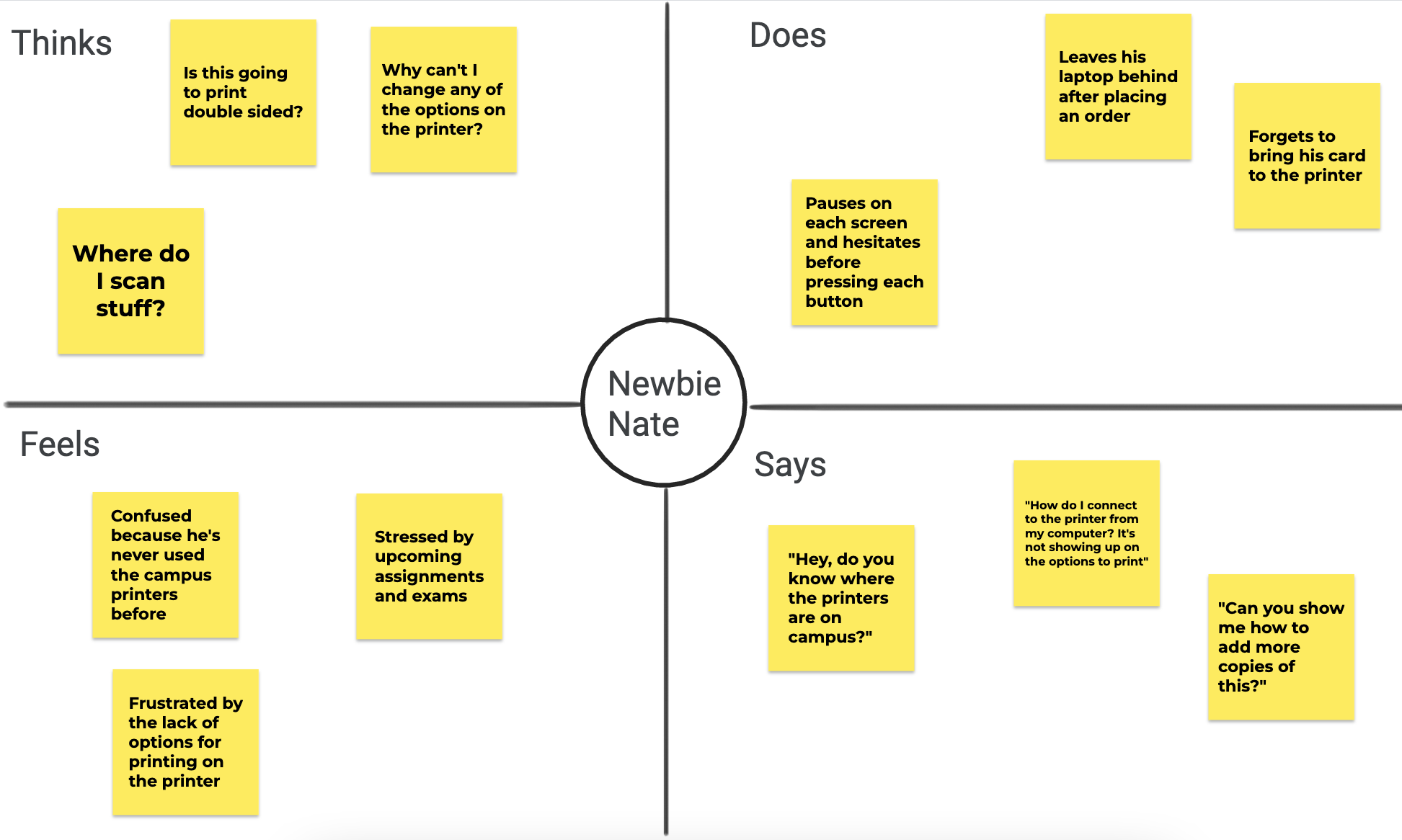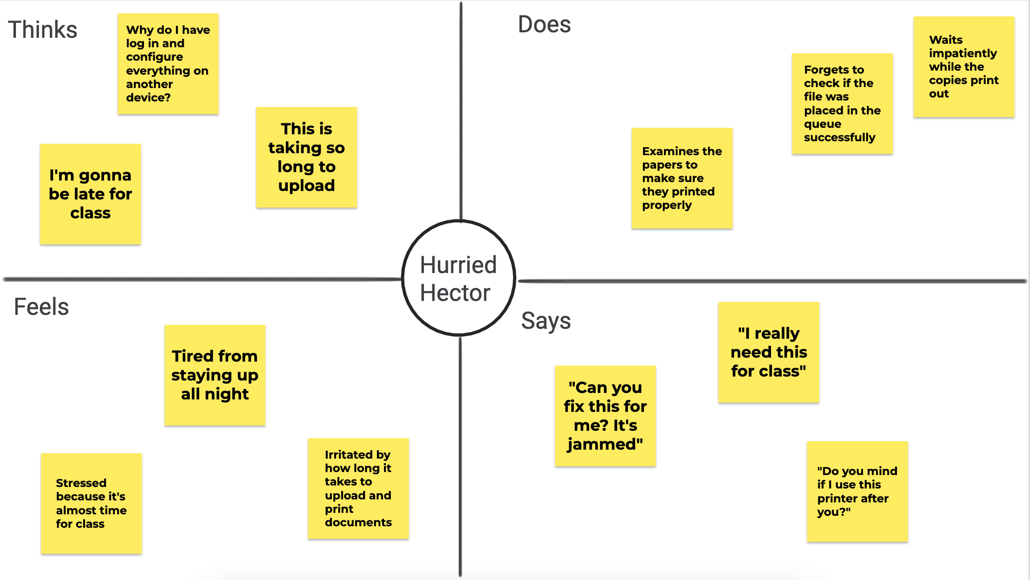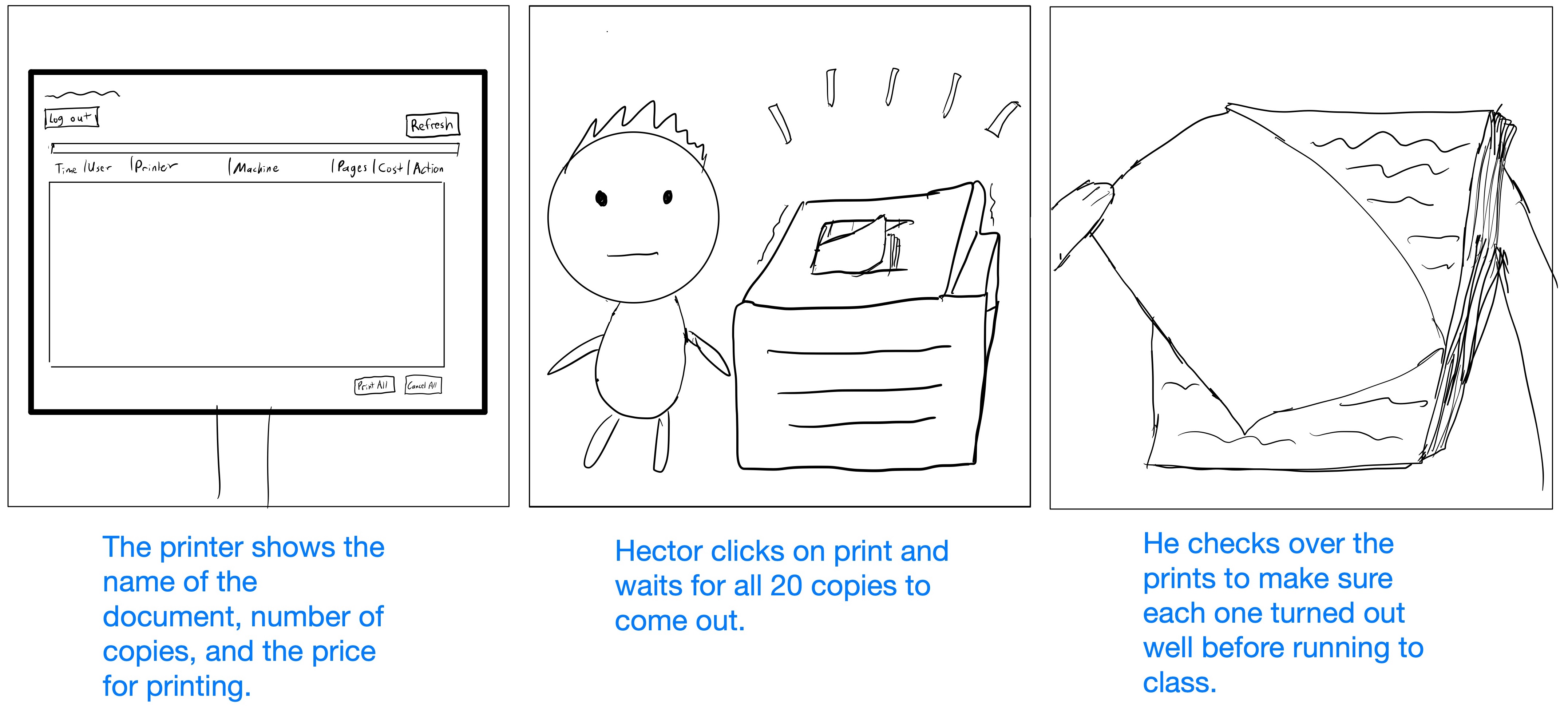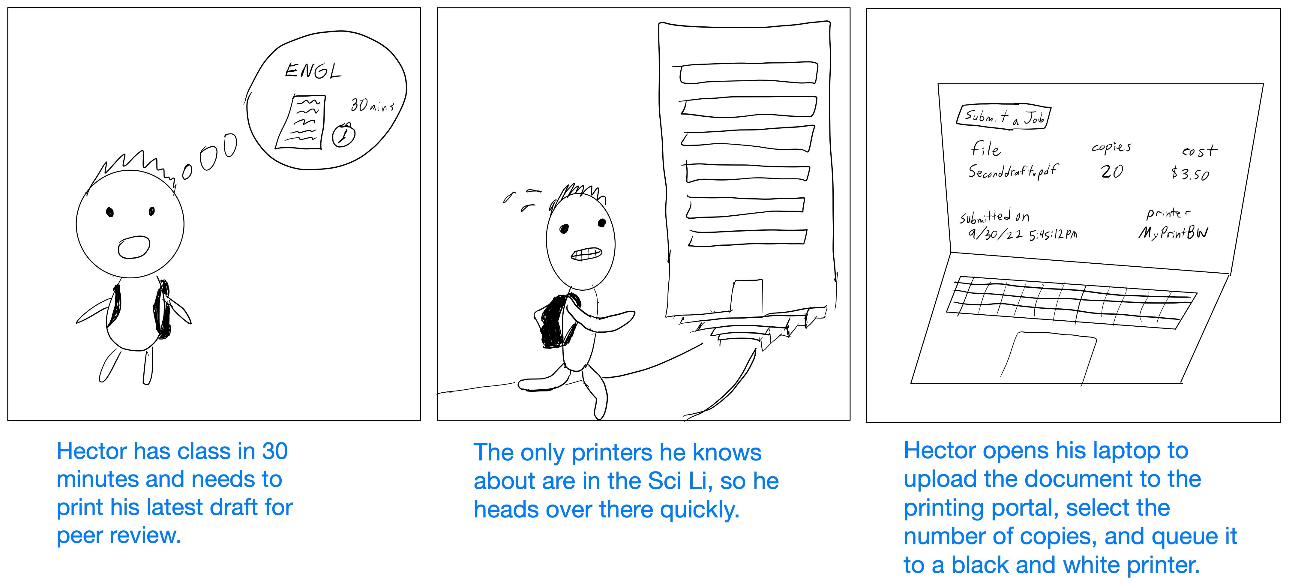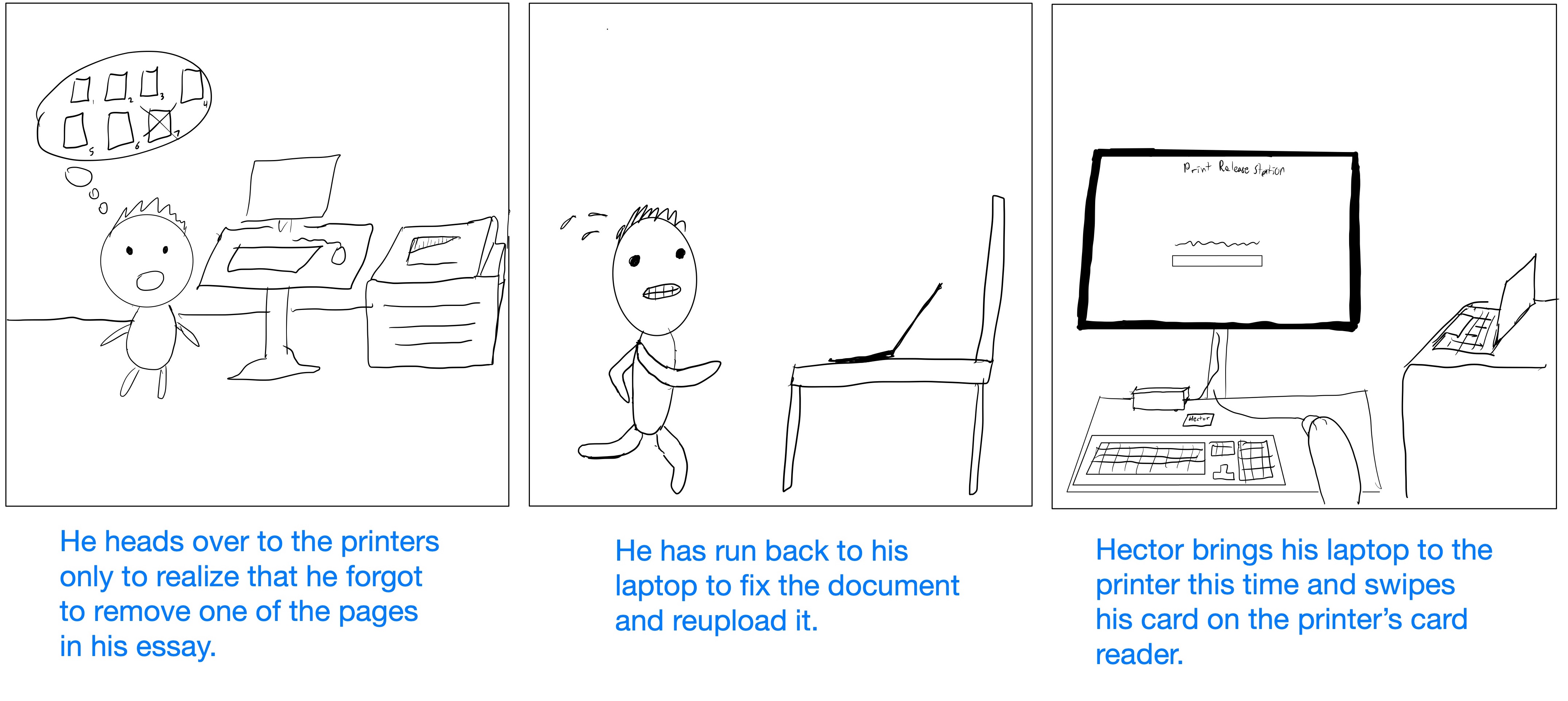 The storyboard takes one of the personas I created and places them in a scenario that exemplifies how that persona would interact with the printer. This is helpful for thinking about what issues certain groups might face when using the printer.